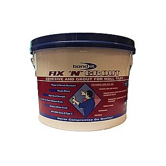 Fix ‘N’ Grout has been designed by Bond it to be a ready mix adhesive paste for use as an all-purpose, thin-bed waterproof ceramic wall tile adhesive and joint filling grout. Suitable for fixing all types of ceramic wall tiles, including mosaics, porcelain and vitrified tiles in internal locations. For use in areas such as bathrooms, kitchens and shower areas, where the tile surface is subject to frequent wetting but not total water immersion. Can be applied to gypsum plaster, cement fibreboard, existing tiles, cement render, timber panels and plywood composite boards.