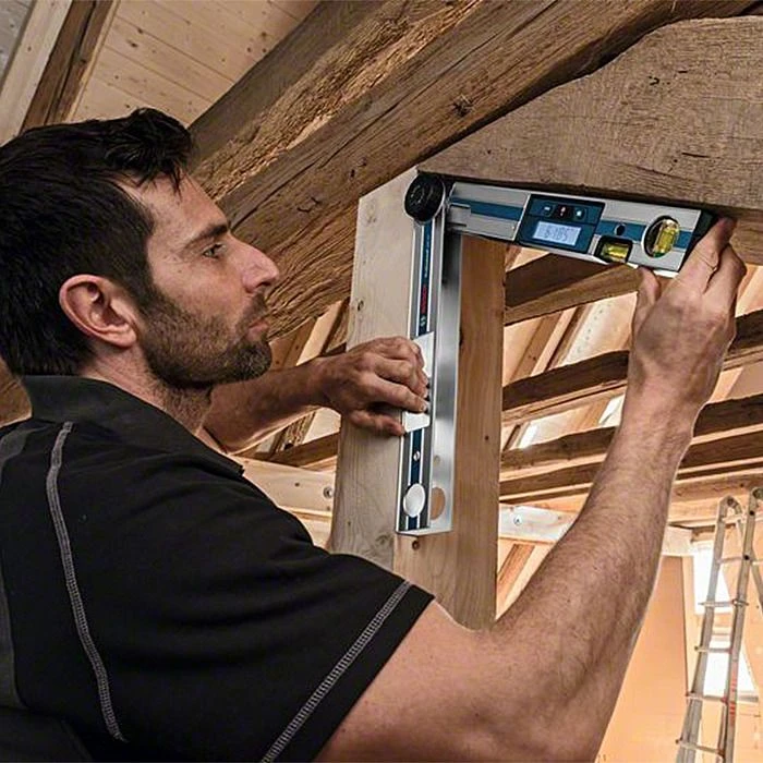 The Bosch angle measurer automatically calculates single and double mitre angles. The angle measurer has an arm extension for hard to reach areas. Acoustic signal, a display that can be read from various angles along with memory and calculations functions allow the angle measurer to make difficult tasks simple.