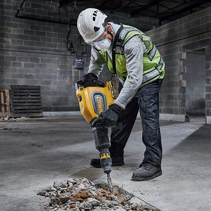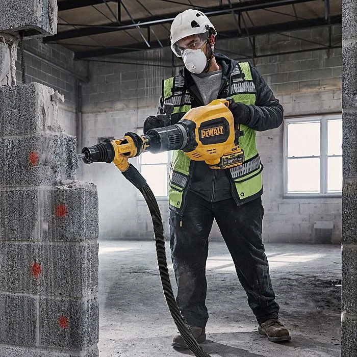 This is part of the new Series 911 breakers from DeWalt, with its sibling being the corded D25911K. The DCH911 is the XR FlexVolt cordless version, running off a single 54V battery, this tool is ideal for tracking to remove material to allow installation of plumbing or electrical services for example. It has an impact rating of 27 Joules or 11 kilograms. The breaker has been designed with ergonomics in mind, to protect the user and to allow the user to work the tool hard, rather than the tool making the user work hard. This machine can be attached to compatible dust extraction systems via an optional extra accessory. When connected to Wireless Tool Control dust extractors, starting the DCH911 will use Bluetooth to start the dust extractor automatically, and upon releasing the trigger, the extraction will stop again after a short delay to clear the extraction hose.