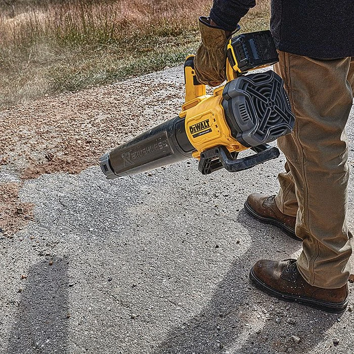 A high performance blower that delivers high speed airflow and uses an axial fan. The axial fan is highly efficient and quieter when compared with a centrifugal fan. The DCMBL562 comes with a removable aerospike attachment which concentrates the airflow for a higher speed up to 125 mph. The blower has a cruise-control style switch that allows you to set a specific speed for consistent results. The components of the machine are arranged in such a way that when a battery is attached, it is very well balanced for optimal user comfort and minimal fatigue. The fan is driven by a brushless DC type motor that has been proven to extend battery lifetime while also requiring less maintenance than traditional brushed motors.