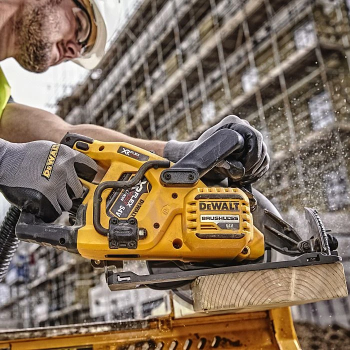 Introducing DeWALT’s newest innovation, the DCS577 FLEXVOLT Worm Drive Style Circular Saw, this new and improved model is geared towards superior performance and faster cuts, making it the perfect match for professionals on the job. This Saw is designed with a 54v Brushless motor, providing extended durability, efficiency and power, capable of delivering an impressive 2400 MWO and a high no load speed of 5800rpm – allowing heavy duty applications to be completed on the go. Suitable for general purpose ripping, cross-cutting and bevelling circular saw for wood and other construction materials.