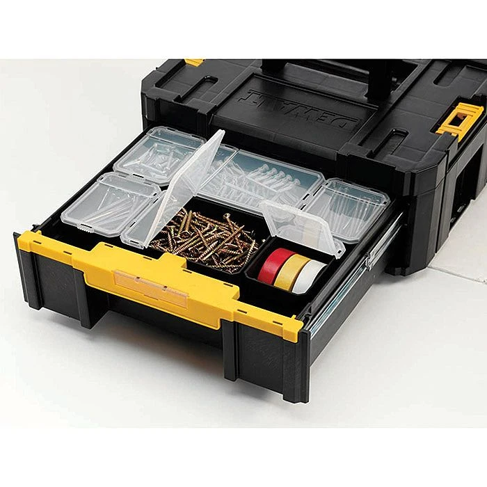 The Dewalt T-Stak Storage box has been designed with professionals in mind. Manufactured from tough polypropylene and featuring 2 large and 4 small removable storage boxes, the T-stak offers a great range of organisers ideal for the storage of a range of tool accessories and small parts. It’s large drawers pull out drawers incorporate smooth metal runners, ideal for the smooth and easy access of tools. The T-Stak Boxes organiser compartments boast label windows for improved organisation while a top situated handle improves portability. Compatible with T-Stak system boxes for easy and compact transport.