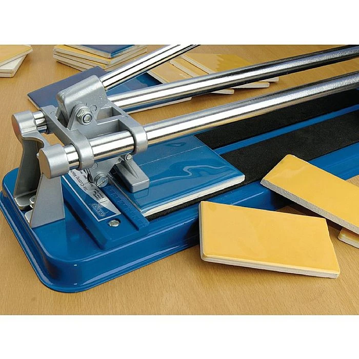Cuts and breaks ceramic tiles in one easy operation. It has a heavy gauge sheet steel base with foam cushion surface, graduated measuring gauge and replaceable tungsten carbide cutting wheel. The tile is placed on foam cushion cutting base and the wheel is drawn across the tile to cut it. Maximum cutting capacity 300mm long x 10mm thick. Machine size 490 x 140mm.