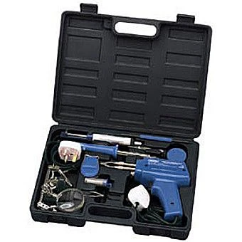 Comprising 30W soldering iron, 100W soldering gun both with BS approved 3 pin plug and 1.2M (approx.) cable, soldering tip, tube of solder, flux, solder sucker, tweezers, wireholder/pointer and workpiece clamp/magnifier. Packed in blow mould case with display sleeve. – DRAPER 230V SOLDERING KIT