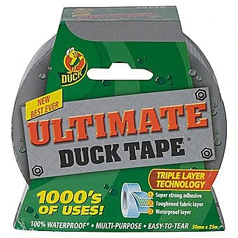 Ultimate duck tape is a multipurpose cloth tape with a difference. It is a triple layer technology which means 3 high performance layers are fused together to create an amazing heavy duty, fabric reinforced- Ultimate duck tape. It has been manufactured to be 100% waterproof, its unique adhesive is also 50% stronger than most cloth tapes and it sticks to most surfaces.