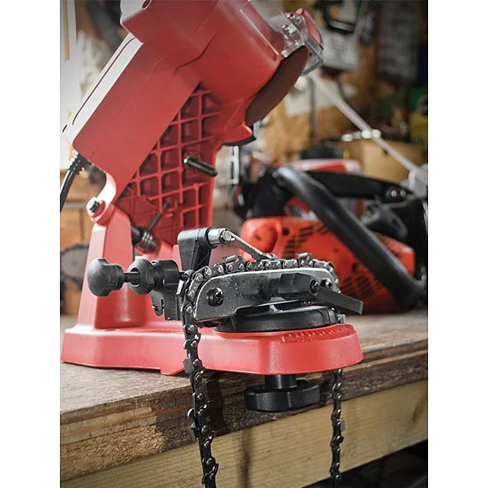 Suitable for sharpening chains from petrol, corded or cordless chainsaws, this sharpener is well-built and designed to be mounted to a worktop. The saw takes a 100mm x 3.2mm grinding wheel which is included. Also included is a comprehensive manual that guides you through the process of sharpening a chain, as well as the adjustments possible to attain the correct angle . For user (and bystander) safety, there is a no-volt release switch. This means that if the power is lost to the machine, and the off switch is not pressed, it regardless will not restart when power is restored, until you press the on button.