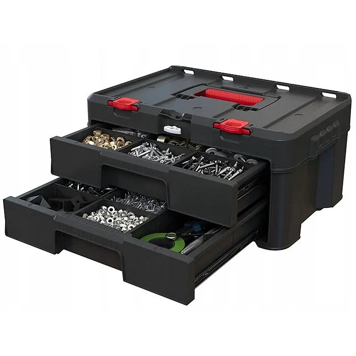 This unit is part of Keter’s Stack N’Roll System which gives you the ability to connect multiple boxes together, making carrying them much easier. They can also be placed on a rolling cart to let you wheel around a large stack of boxes containing heavy hand and power tools. The unit has two drawers which are kept in place during transportation using a bar that flips up and latches into place.