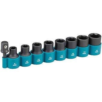 This set of eight 1/2″ square drive sockets are impact rated allowing for use in impact wrenches. The inclusion of a 1/4″ hex to 1/2″ square drive adaptor also allows you to use this in your impact driver too. The set is supplied in a rack that would be ideal in the toolbox along with your impact, or in the pocket of a tool bag. The set includes sizes 8, 10, 12, 13, 14, 15, 17 and 18mm, and each bit is manufactured from “Chrome Moly” steel for long lasting tools.