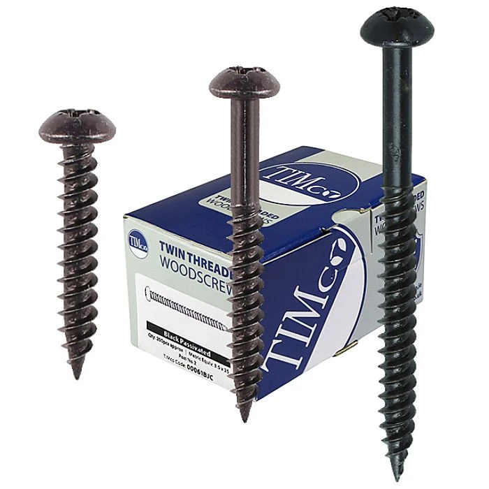 These screws from TIMco are designed for wood and are especially useful for use with black ironmongery thanks to the black passivated finish. They have a twin thread for a strong pull, and a round head for good clamping force. Sold as boxes of 200, and available in various different lengths of screws. Also available on our site in different sizes and pack quantities.